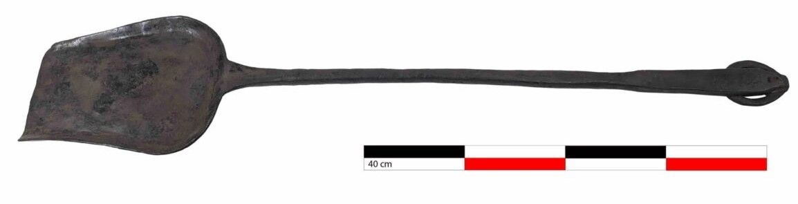 De stoker had – naast de kenmerkende vuurschep - meer gereedschap: een pook om het vuur op te porren, een bezem om de as weg te vegen, een korte ijzeren staaf waarmee hij de waterkranen open en dicht kon draaien. Vuurscheppen zijn zelden in opgravingen van badhuizen gevonden, maar wel in Romeinse keukens waar ook een vuur werd gestookt. Vier van dit soort scheppen zijn in Limburgse villa’s gevonden. Eén exemplaar lag bij het badhuis van Maastricht. Goed te zien is de ring waarmee de schep kon worden opgehangen en de verhoogde randen bij het blad van de schep, om te voorkomen dat de as eraf viel.