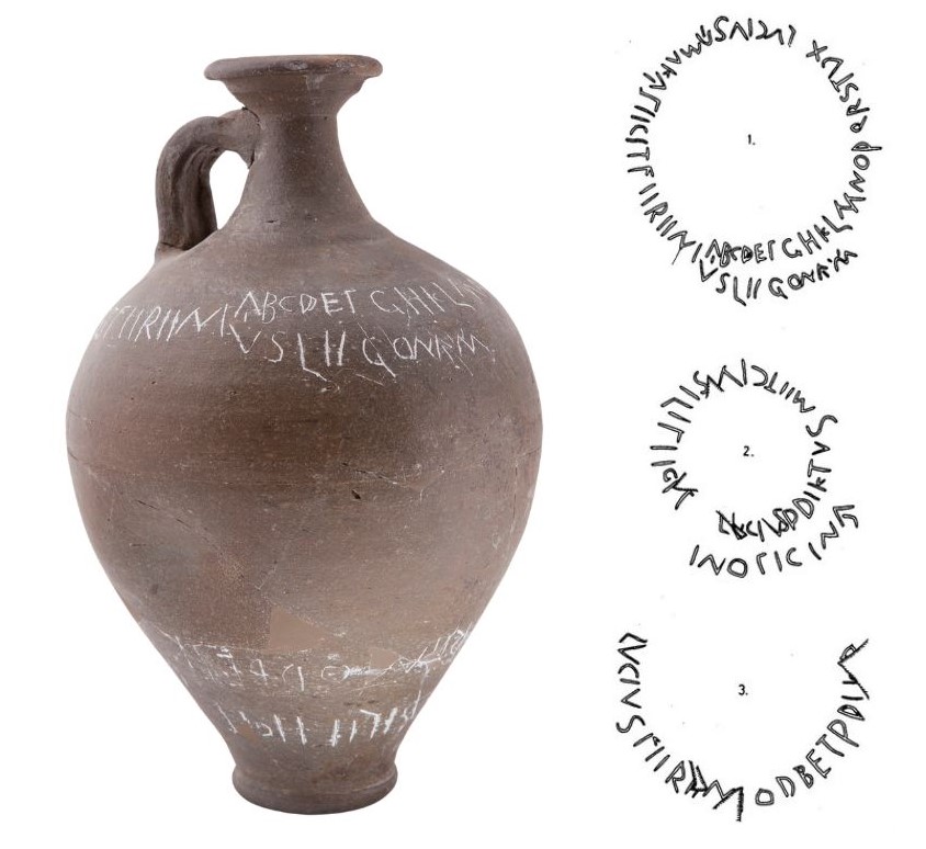 De eerste zin luidt: ‘Lucius Amaka fecit Ferenius ligonam’ – ‘Lucius Ferenius heeft deze kruik gemaakt voor Amaka.’ Een persoonlijke boodschap, rechtstreeks uit de Romeinse tijd…